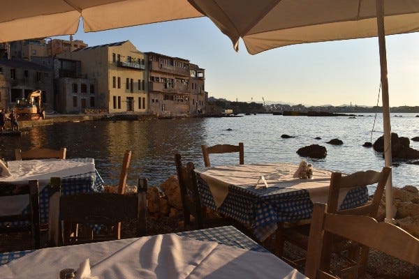 After a twenty-minute drive east of Chania along the coast, threading through a maze of unmarked left turns, we found ourselves in the historic Tabakaria neighborhood of Halepa. The narrow alley, barely accommodating our car, ended at a secluded gem tucked near the weathered ruins of 19th-century tanning factories. We stepped out into a tableau of crates stacked haphazardly against a white-washed wall, the annoyed glare of a curious feline, and the faint, savory whisper of something simmering just out of sight. A warm breeze carried with it the unmistakable tang of the sea, and the late afternoon sun began to cast elongated shadows over the harsh stone. This was a place that held its secrets tightly, revealing them only to those who sought them with intention. It was not a place one stumbled upon. We had come early, eager not only to sample the food but to soak in the view, one that seemed to define the essence of a Greek seaside taverna.