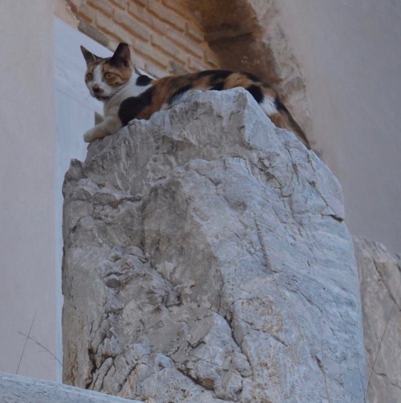 If cats rule the city of Athens then both the Athenian and Roman Agoras are their home base. They welcome you to their city with nonchalant looks and pure indifference. As you walk though the ruins they appear and disappear in the most unexpected places, mostly in the shade, and as evening falls you hear them calling the clowder together for the night. I wonder, as I watch them, which are feral and which go home at night to their human families and what each type thinks of the other.