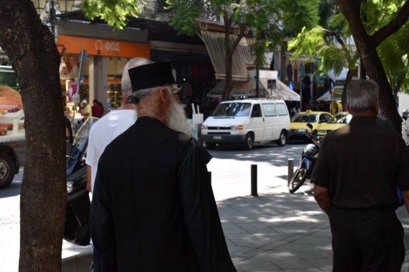 The church has very specific hours and so we’ll need to return, but I’m not dismayed. We grab an espresso at the cafe on the corner and stand outside admiring the structure. This is the expensive shopping street in Athens and tourists from the world are browsing, shopping, buying. The juxtaposition of the church and the H&M store seems totally in place.