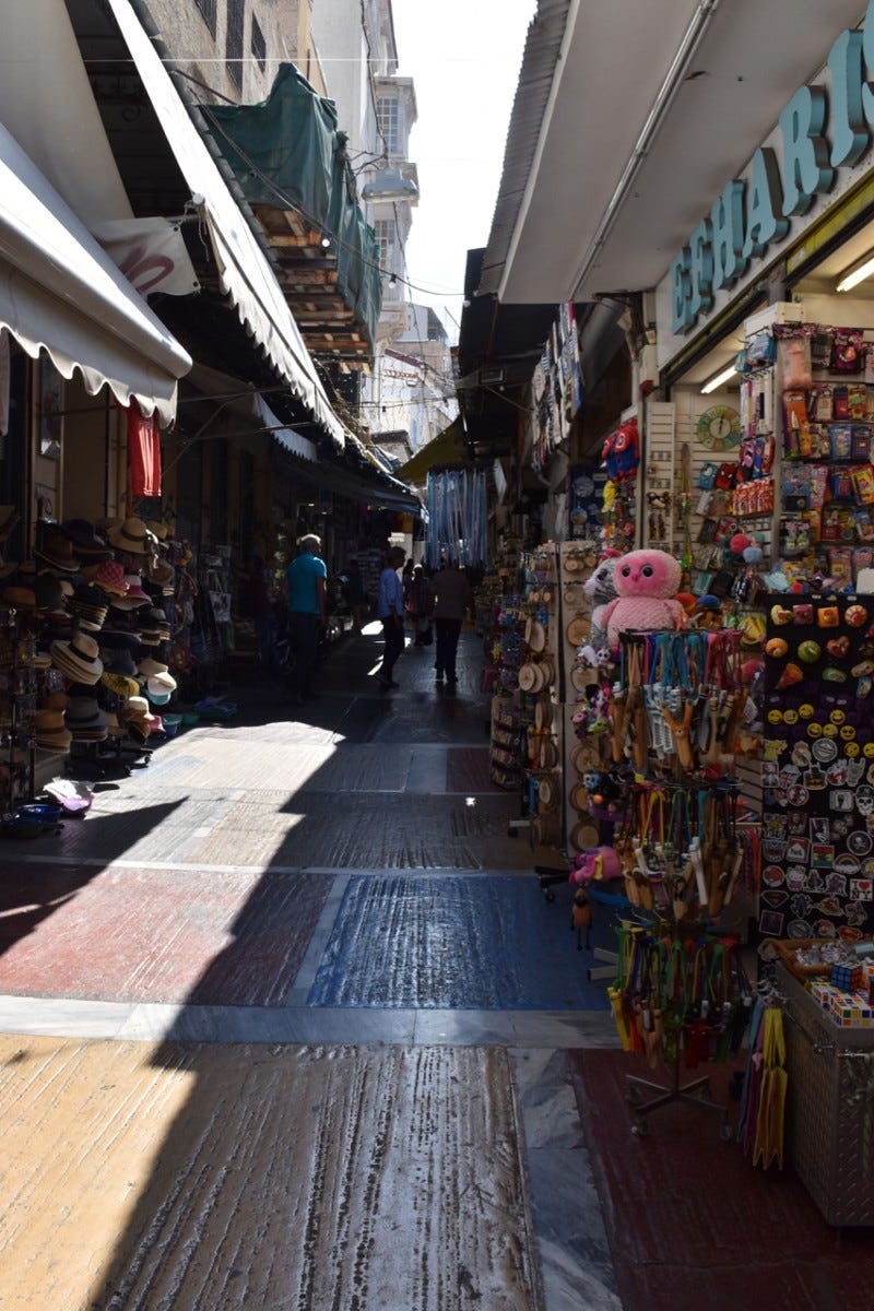 Satiated from our first meal in Athens, we headed out into the sun across the plaza and past the train station towards the Athenian Agora. The street, narrow and crowded with stores selling everything from beads to athletic shoes, is filled with tourists and locals, searching for the best deal.
