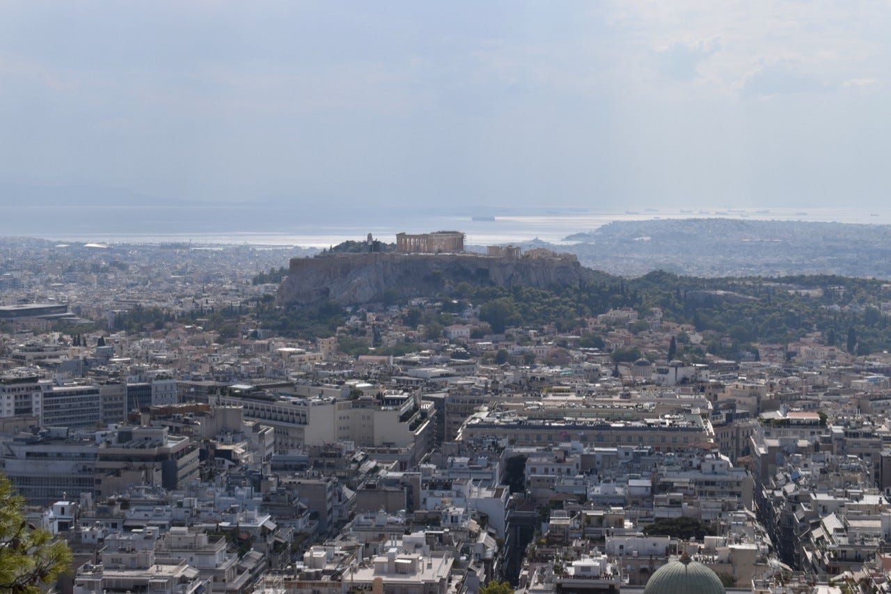 After slowly walking back through the old part of the city and having one last drink looking up at the Acropolis, we pick up our rental car and drive to the highest point in Athens to overlook the city and say farewell.