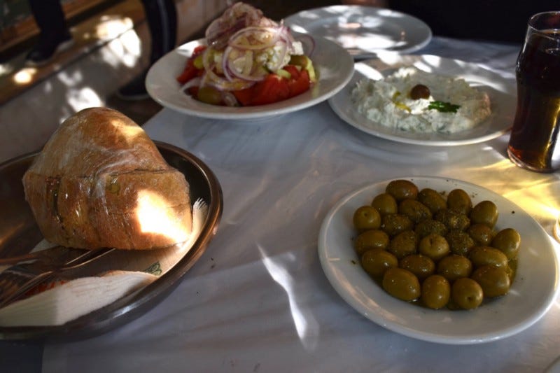 The olives, greek salad, and bread came first, with the tzatziki. Oh, the tzatziki. I need to pause a moment to collect myself. It’s such a simple thing, really, but like all simple things, if done correctly they can be transcendent. The tzatziki was so good it made me buy the bread. In Greece, bread with your meal is not free. It comes wrapped in plastic and is not very good. You don’t eat it. If you unwrap it, you have bought it. So you don’t unwrap it. But I didn’t care. I tore the plastic off of the bread and spread on more than a polite amount of the tzatziki. Rich, creamy, herbaceous, and refreshing it was full of cucumber with a touch of acidity. It was unlike any I had ever had back home and I cursed every Greek restaurant and diner who had lost the old ways. I stopped making a fool of myself, eating the condiment like a side dish, and helped with the salad. The tomatoes were red, sweet, and juicy, and unlike the tasteless mass-produced tomatoes here in the States, they tasted like the tomatoes of my childhood. This was my first meal in Greece and already I knew it would remain in my memory forever. Then came the mixed grill and I knew that Athens and I would be long friends.