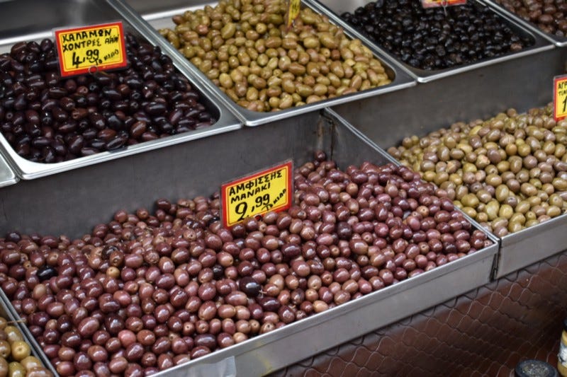 I shake the thought and we head to the outer stalls in search of olives. Each vendor has bins or buckets of their different varieties, seasoning blends, and olive blends and each will offer you samples, enticing you to buy. They are unlike anything I have tasted. Briny, rich, and sumptuous, each becomes my new favorite, until I hit the king of olives, the kalamata. Dark and meaty, I quickly purchase a pound to have vacuum sealed to take back home. As the bag is being sealed, I seriously wonder if I can keep from opening them during the rest of the trip. I can imagine nothing better than a dinner of some bread, olives, tomato, feta, and a deep, rich, red wine while overlooking the Mediterranean. I put the pouch in my bag, not quite sure of its fate.