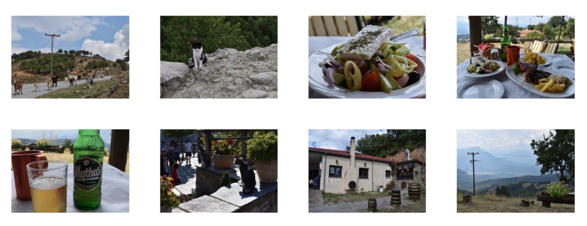 The lunch was the same simple meal that has been served for generations; a simple salad of cucumber, onion, tomato, green pepper, and feta, dressed with a bit of olive oil and herbs, meat grilled over a wood fire, rice, and fried potatoes, crisp, hot, and buttery on the inside. And in that moment, in that place, sneaking bits of potato to the kittens below the table, looking out over the hills, and sitting with the love of your life, there is no place better to be.