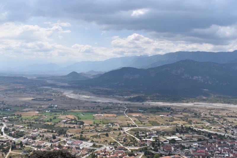 Looking below you see the Thessaly valley stretching across the other range of mountains. This was the rich and fertile land that enticed and brought the Turks and forced the religious hermits to seek refuge at the tops of the monoliths.