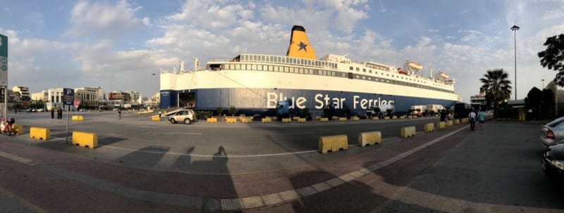The Blue Star ferry that we are taking overnight to Crete is not yet ready to board so we park ourselves across the street to have a bite to eat. It is a beast of a ship and it is a thing of beauty to watch it load. Hours before the public can board, the loading of trucks begins. Tractor Trailers driven by those who have done this a hundred times before, zip alongside the ship, pulling in front of the rear of the ship until the trailer is in the proper position and then back the truck up the ramp into the proper position. This is my first experience with ferries of this size and the orchestration required to load vehicles efficiently and logically is something to behold. A beer and a pizza later we are able to meet our car rental agent to return the car and take our place aboard the ferry to Crete. Tomorrow morning we will wake up and be on an island I have wanted to visit for years.