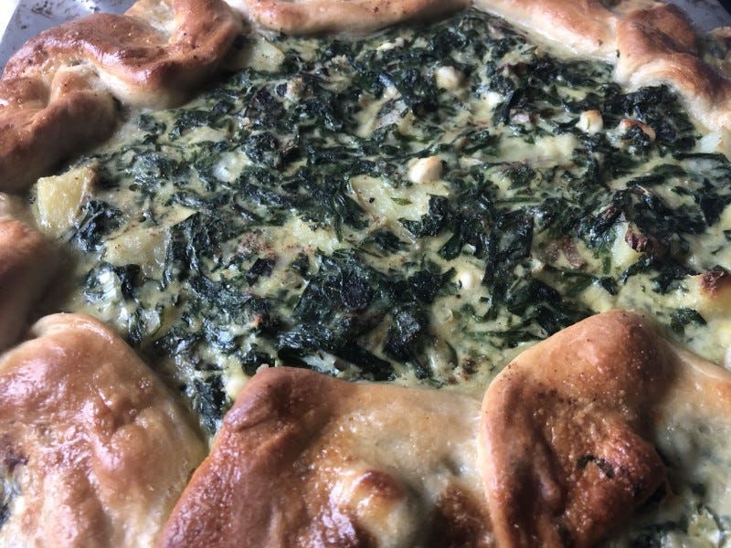 The September sun rose quickly and kept pace with the volume of tourists as we made our way to a few more of the monasteries. As we walked from the car to the the trail that led to the next monastery we walked through vendors selling water, trinkets, and food. I was more curious than hungry when I handed over a few euros for a wedge of spinach pie. This was my introduction into authentic greek pie and I was not expecting what I tasted and from a small cart on the top of a large hill. The crust was crispy and buttery, almost a phyllo, but with more thickness. And the filling was a harmony of greens, onion, ricotta, and potatoes. Sitting in the comfort of our air-conditioned car, and being watched closely by one of the local cats, we questioned if we should get a second wedge. I still can’t replicate the recipe exactly, but have found a favorite substitute in Martha Rose Shulman’s cookbook Mediterranean Harvest which I make at least once a month.