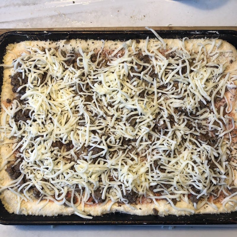 Using a spoon, evenly spread 4–6 tbsp of the sauce on the dough, making sure to go to the edge of the pan, but not the sides. Sprinkle with 1tbsp of oregano, and the parmesan cheese. I sprinkle the cheese on the edges as well. Evenly spread the chopped basil on the pizza, then 1/2 of the onions, and then 1/2 of the ground beef. Cover with shredded mozzarella cheese and bake for 25–30 minutes until the crust and cheese are lightly browned.