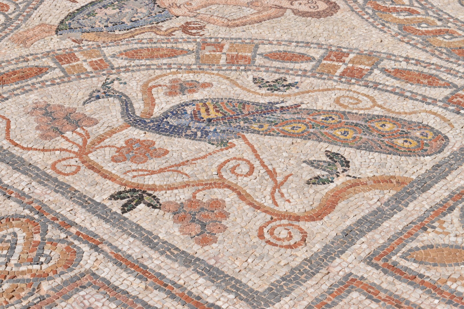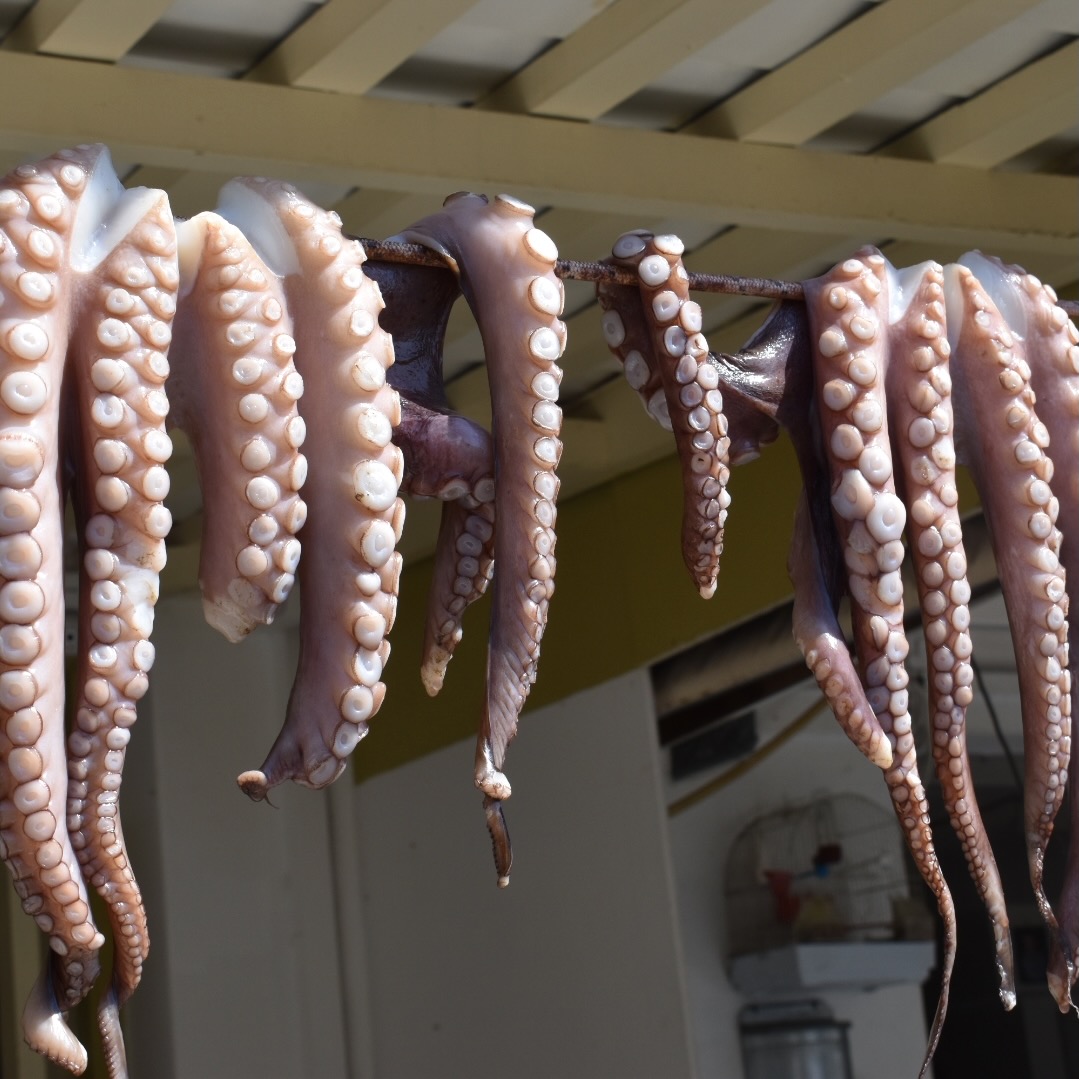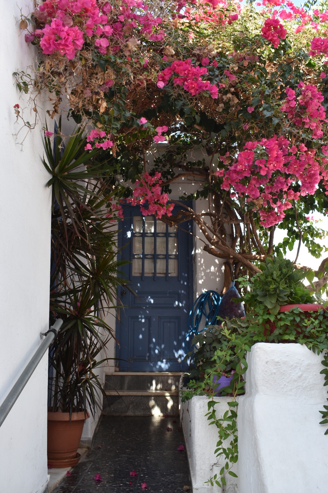 After lunch we walked the streets and alleys, going deeper into the whiteness — bougainvillea bursting red against the marble and stone buildings, blue doors and white bordered granite streets beckoning us deeper into the city’s embrace. We eventually, and happily, arrived at the top of a large hill and the Archaeological Museum of Naxos and viewed the tile mosaics while overlooking the town from above.