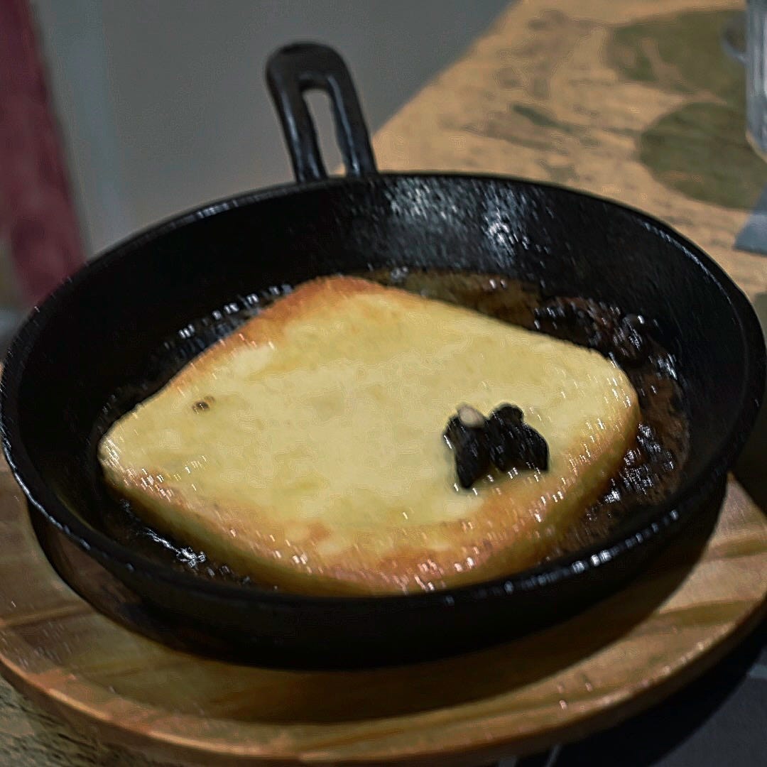 - Fry on one side about 2 minutes until golden and crisp. Then flip, again flipping away from you, and fry the other side another 2 minutes until golden and just starting to melt.