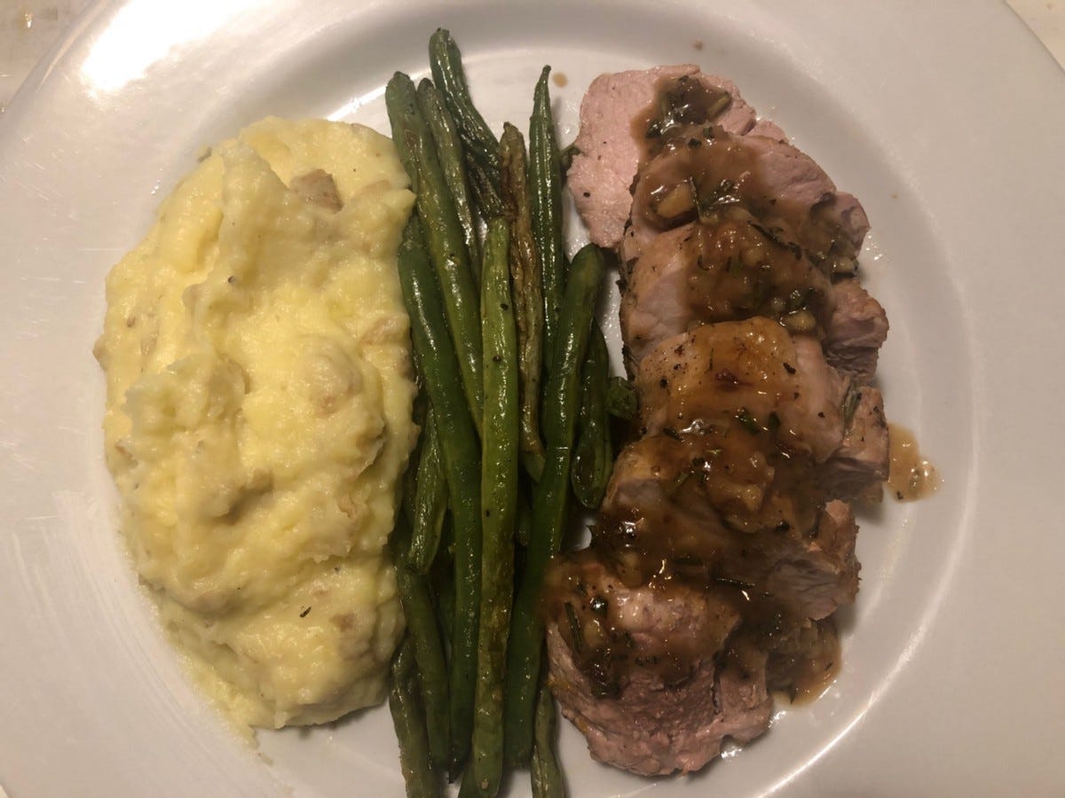 This was the splurge meal for this order and the scallops were fresh. The corn-bacon cream sauce was decent and the potatoes were simple. It was lacking a little bit of flavor, but overall above average. - Pork Chop with Creamy Shallot Demi-Glace and Asiago Roasted Cauliflower